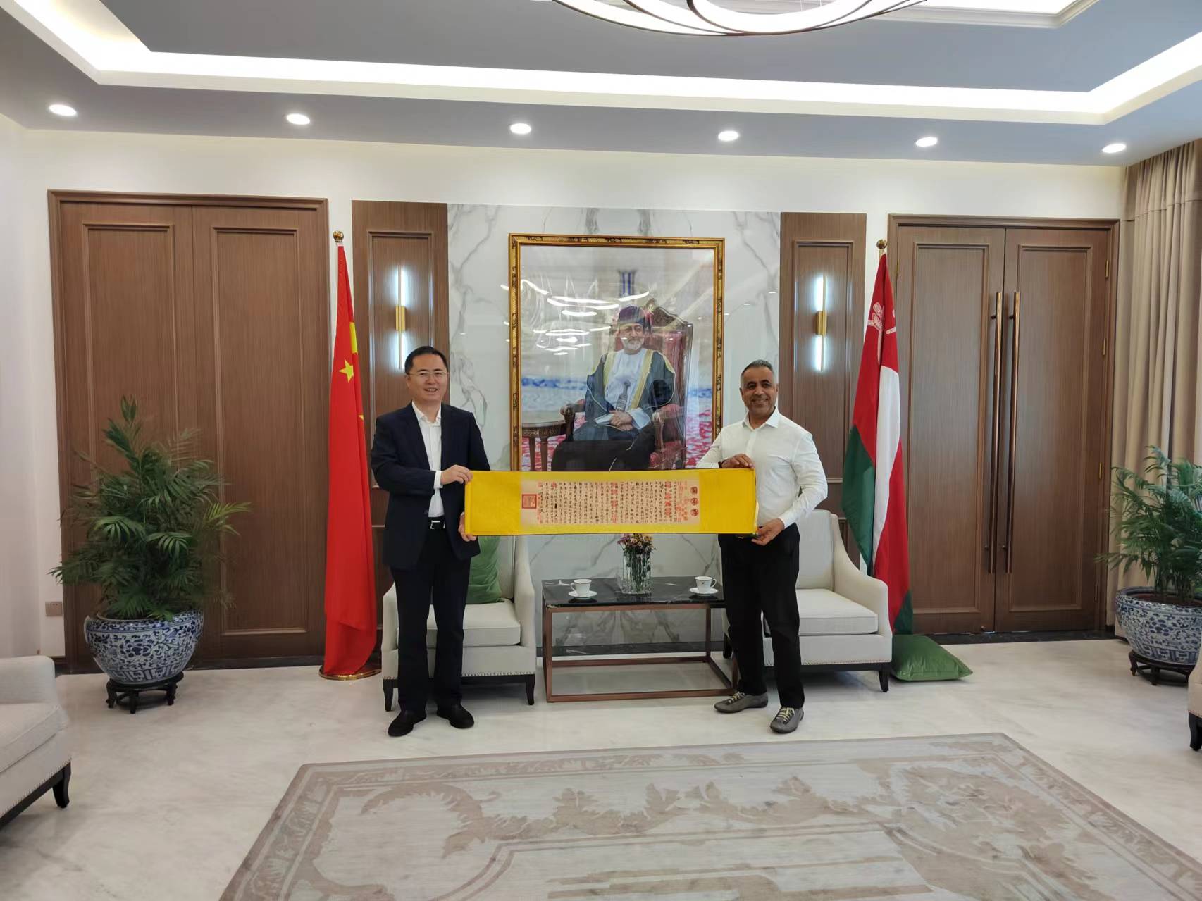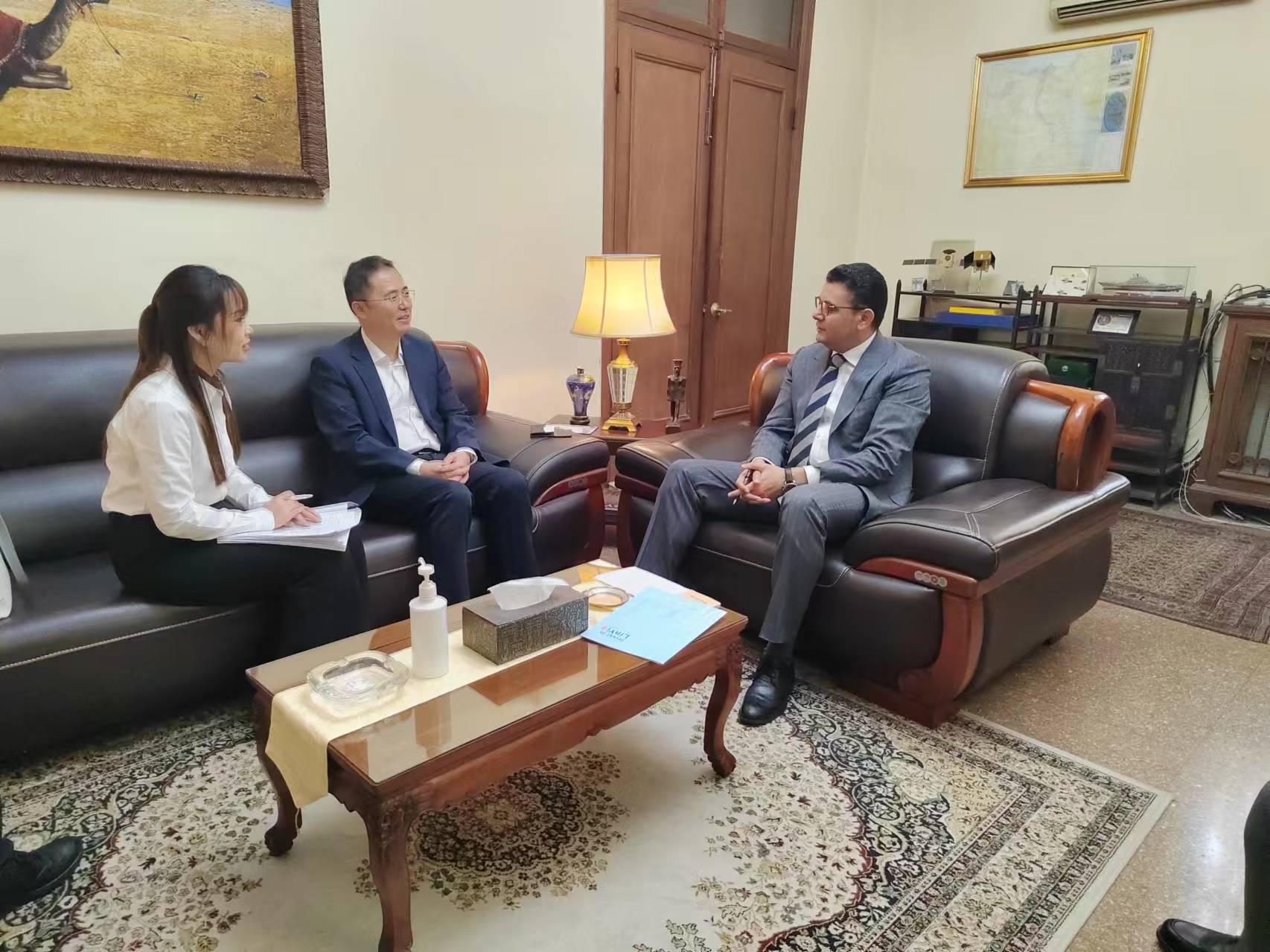 24日上午,临沂市外办拜访了阿曼和埃及驻华大使馆,与阿曼驻华大使纳赛尔·布塞义迪先生、埃及驻华大使馆副馆长海赞姆·阿卜杜哈迪先生分别进行座谈交流。张剑介绍了临沂市经济社会发展情况,重点强调了双方在投资、贸易、物流等领域的合作潜力,以及在文化旅游等方面拓展合作的愿望。双方一致认为此次拜访为双方搭建了沟通的桥梁,开启了新的合作机遇之门,均表示将以此次拜访为契机,进一步加强后续的沟通交流和人员互访,推动双方在投资、贸易、物流、文化、旅游等领域的务实合作。纳赛尔大使还热情邀请临沂市代表团参加9月27日上午由阿曼驻华大使馆主办的投资贸易推介会。